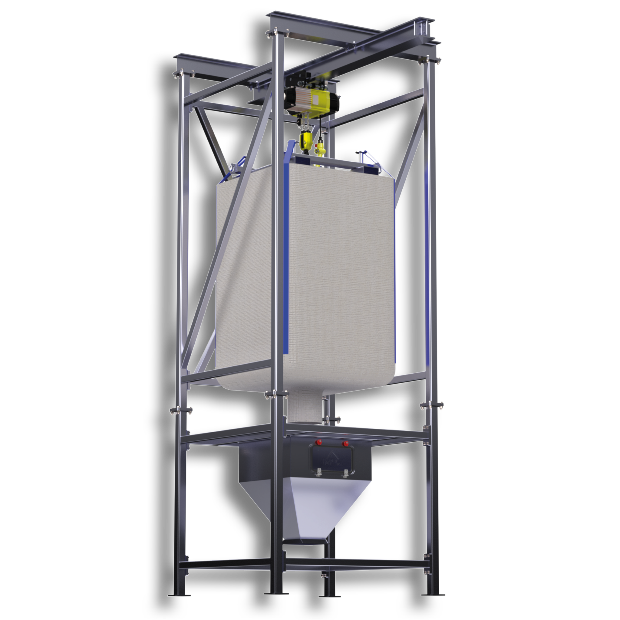 Big Bag Frames are robust, modular support structures specifically designed to hold, lift, and discharge large bulk bags, or FIBCs (Flexible Intermediate Bulk Containers), commonly used for storing and transporting bulk materials like powders, granules, or heavy-duty goods. These frames not only support the weight of the bags but also ensure controlled and efficient discharge of materials, reducing spillage and waste. In industrial settings such as plastics, chemicals, agriculture, and food processing, Big Bag Frames can be customised with features like vibration cradles, bag massagers, blowing systems, dust extractors, and smart sensors for remote monitoring to enhance operational efficiency. By automating material handling processes and improving safety, they help manufacturers reduce manual labour, increase throughput, and maintain a clean working environment.